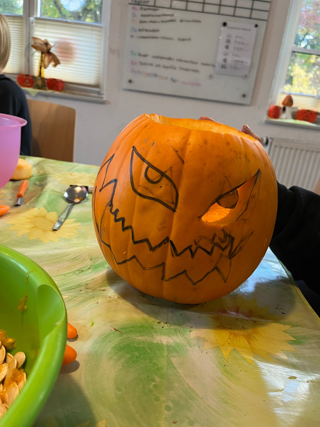 Beim Kürbisschnitzen hatten wir ganz viel Freude! Mit kleinen Messern und großen Ideen haben wir lustige und gruselige Gesichter in die Kürbisse geschnitzt. Manche Kürbisse lachen, andere schauen richtig fies – aber alle sehen super aus! Jetzt sind wir bereit für Halloween!