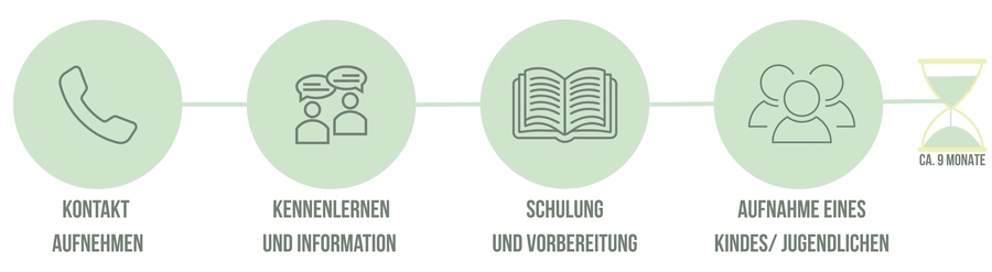 Über einen Zeitraum von um die 9 Monate werden die interessierten Familien innerhalb eines themenorientierten Curriculums mit Einzel- und Gruppenseminaren für die Aufnahme von Pflegekindern vorbereitet.
